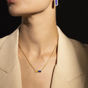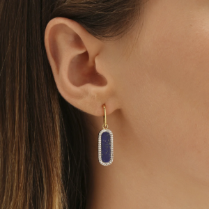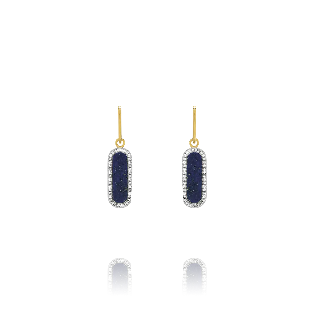 Cette paire de boucles d’oreilles se distingue par son pendant rectangulaire en lapis lazuli cerclé d’oxydes de zirconium. La couleur bleue de la pierre naturelle assemblée aux oxydes de zirconium reflète la lumière apportant élégance et modernité.