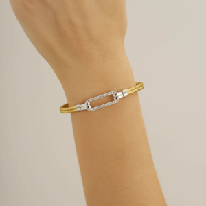 Ce jonc possède un double tressage en argent 925 doré complété d’un maillon en argent rhodié serti d’oxydes de zirconium. Ce bracelet est ouvert pour s’adapter à chaque poignet.