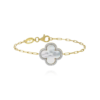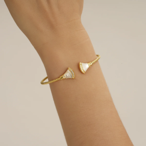 En argent 925 doré, ce bracelet jonc ouvert est orné de deux motifs inspirés de la Tour Eiffel. La nacre blanche surmontée d’oxydes de zirconium confère à ce bijou une rare distinction.