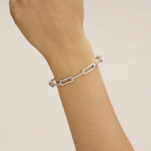 Ce bracelet rigide alterne des maillons allongés liés par une barrette sertie d’oxydes de zirconium. La simplicité de ce bangle en argent massif 925 offre un design pur et minimaliste.